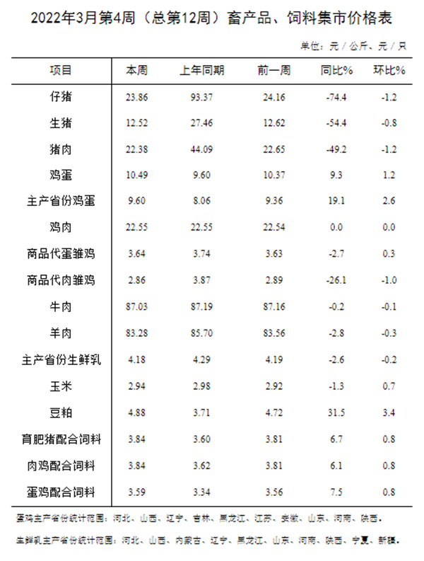 据对全国500个县集贸市场和采集点的监测,3月份第4周(采集日为3月23日)鸡蛋、商品代蛋雏鸡、饲料价格上涨,生猪产品、商品代肉雏鸡、牛羊肉、生鲜乳价格下降,鸡肉价格基本持平。