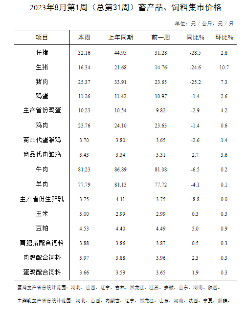 据对全国500个县集贸市场和采集点的监测,8月份第1周(采集日为8月2日)生猪产品、家禽产品、牛羊肉、饲料价格上涨,生鲜乳价格持平。