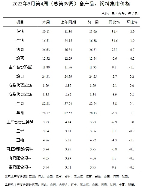 饲料价格。全国玉米平均价格3.03元/公斤,比前一周下跌0.3%,同比上涨0.7%。主产区东北三省玉米价格为2.77元/公斤,比前一周下跌0.7%;主销区广东省玉米价格3.11元/公斤,比前一周下跌1.9%。全国豆粕平均价格4.83元/公斤,比前一周下跌0.6%,同比下跌5.8%。育肥猪配合饲料平均价格3.93元/公斤,比前一周下跌0.3%,同比下跌1.5%。肉鸡配合饲料平均价格4.04元/公斤,比前一周下跌0.2%,同比上涨0.7%。蛋鸡配合饲料平均价格3.73元/公斤,比前一周下跌0.3%,同比上涨0.3%。