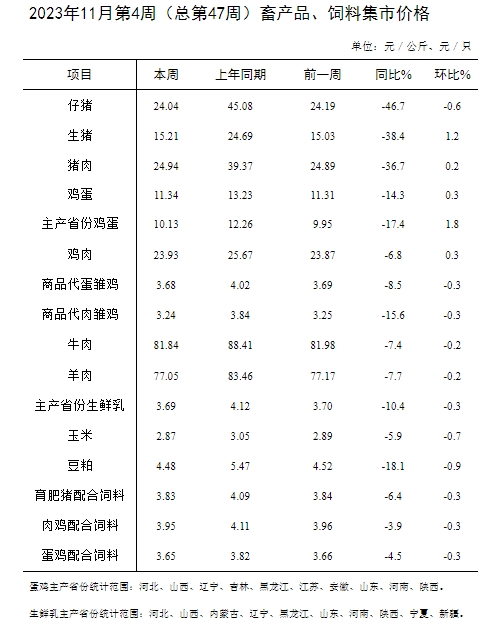 家禽产品价格。全国鸡蛋平均价格11.34元/公斤,比前一周上涨0.3%,同比下跌14.3%。河北、辽宁等10个主产省份鸡蛋价格10.13元/公斤,比前一周上涨1.8%,同比下跌17.4%。全国鸡肉平均价格23.93元/公斤,比前一周上涨0.3%,同比下跌6.8%。商品代蛋雏鸡平均价格3.68元/只,比前一周下跌0.3%,同比下跌8.5%。商品代肉雏鸡平均价格3.24元/只,比前一周下跌0.3%,同比下跌15.6%。