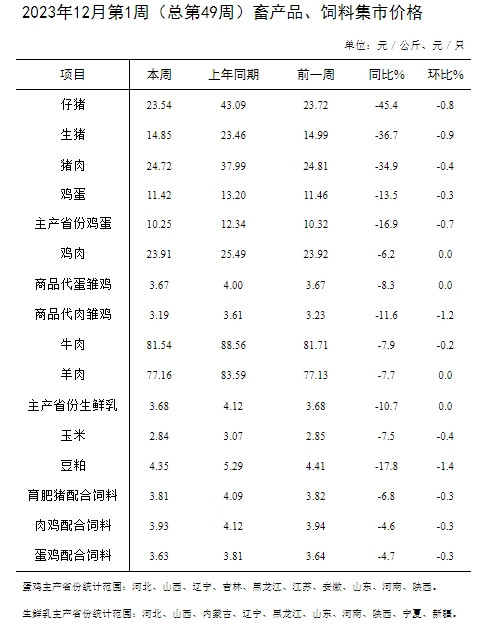 据对全国500个县集贸市场和采集点的监测,12月份第1周(采集日为12月6日)生猪产品、鸡蛋、商品代肉雏鸡、牛肉、饲料产品价格环比下跌,鸡肉、商品代蛋雏鸡、羊肉、生鲜乳价格基本持平。