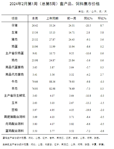 据对全国500个县集贸市场和采集点的监测,2月第1周(采集日为2月1日)生猪产品、家禽产品、羊肉价格环比上涨,牛肉、生鲜乳、饲料产品价格下跌。