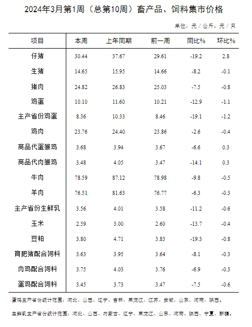 据对全国500个县集贸市场和采集点的监测,3月第1周(采集日为3月7日)仔猪、商品雏鸡价格环比上涨,生猪、电子游艺平台