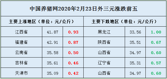 外三元均价为37.58元/公斤,猪价较昨日下跌0.49元/公斤,较上周下跌0.96元/公斤。涨幅在0.05-0.93元/公斤,跌幅在0.02-1.00元/斤之间。