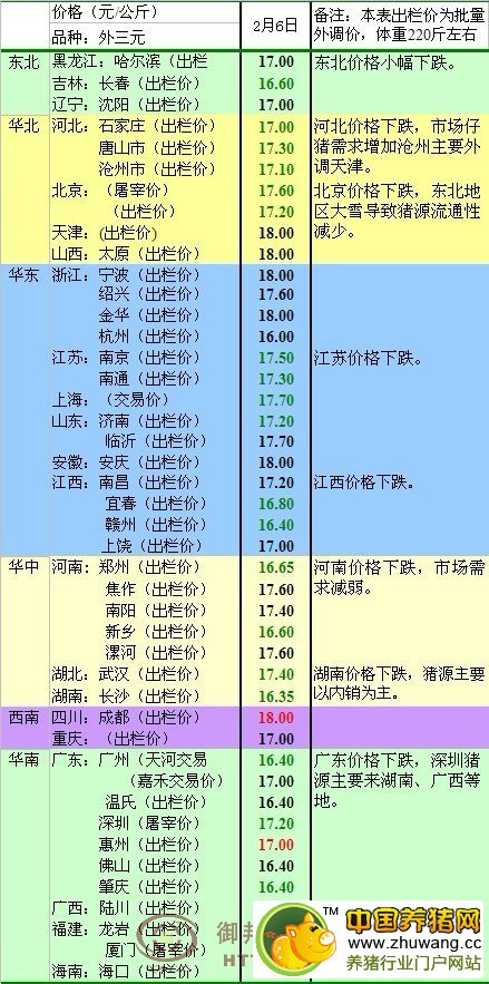 昨日湖南生猪出栏均价16.90元/公斤。其中长沙、益阳生猪出栏价16.35-16.40元/公斤,湘潭、衡阳、邵阳、娄底、常德、郴州等地生猪出栏价16.60-16.80元/公斤,株洲、岳阳、永州等地生猪出栏价17.00-17.20元/公斤, 2月6日全国生猪出栏均价17.11元/公斤,全国猪粮比7.53:1。其他地区生猪价格请见下表。