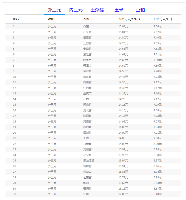 价格,外三元、内三元、土杂猪则为生猪品种。)