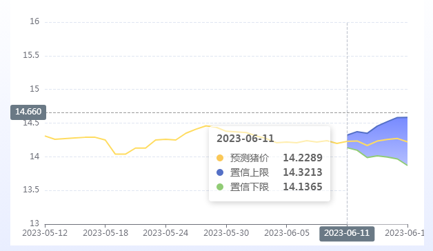 玄田算法是由项目课题组团队原创的非经典逻辑数值聚合理论和不确定性预测方法,构建了基于一致模算子的生猪价格预测模型。该模型采用的聚合函数及一致模相关理论与方法已获得多项国家自然科学基金和省级自然科学资金资助,并获得多项省级自然科学奖奖项。6月11日预测猪价为14.2289,置信区间在14.1365--14.3213之间。6月12日预测猪价为14.2360;6月13日预测猪价为14.1684。