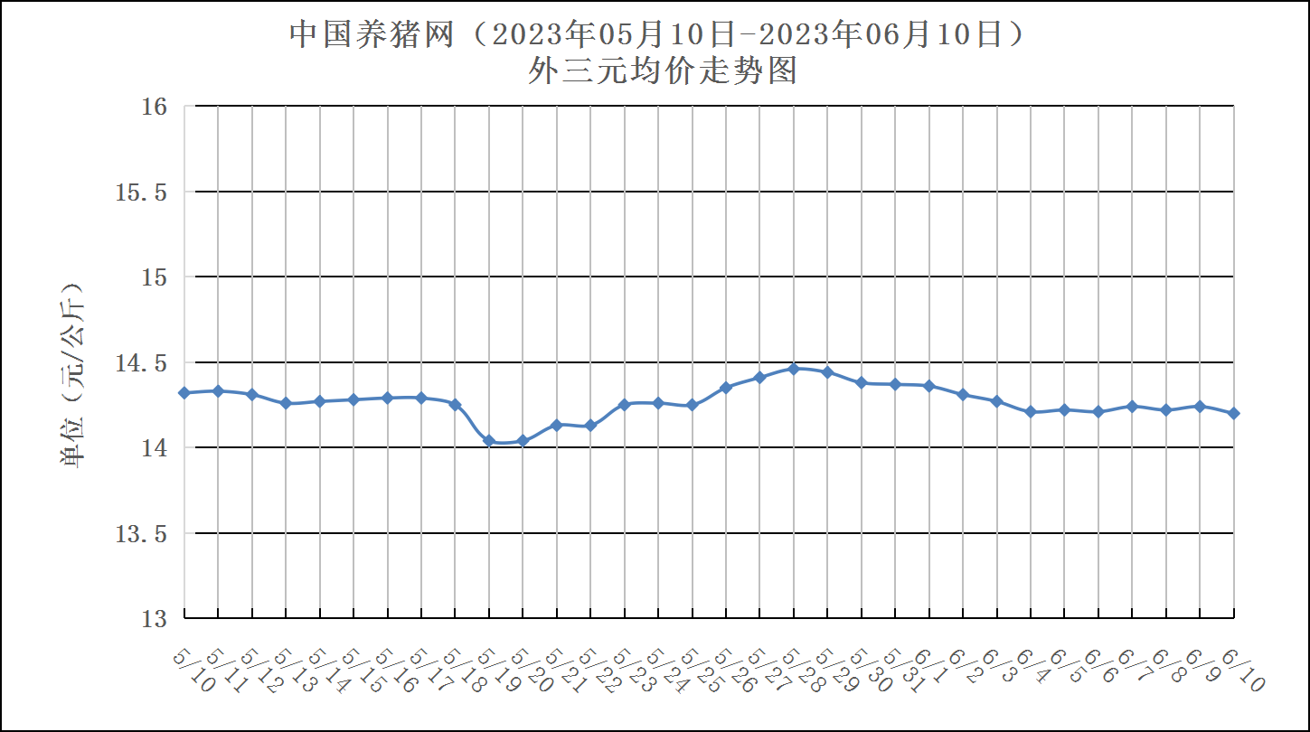 猪价系统数据监测如下:生猪(品种:外三元)均价为14.20元/公斤(7.10元/斤),价格较昨日下跌了0.04元/公斤(0.02元/斤);猪价环比下跌了0.84%;同比下跌了11.19%;