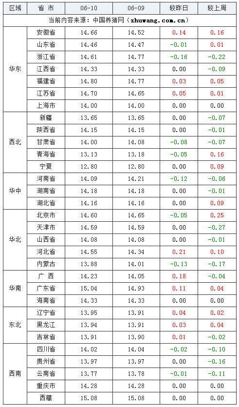 生猪(外三元)均价涨跌表”发现,国内外三元生猪呈现小幅上涨行情,在全国可监测的31个省/市/自治区中,猪价走势为9涨13平9跌,全国各地涨跌互现,东北地区全部上涨。按照目前的市场形势来看,在6月下旬国内猪价或将迎来实质性的增长变化,毕竟基层猪价处于亏损的状态,养殖端对于未来一段时间的猪价趋势也有各自的研判。根据相关专家分析显示,在6月中下旬之后,适重标猪的供应很有可能会面临减少,因端午小长假的利好因素,国内猪价很有可能会总体呈现稳步反弹的利好变化。