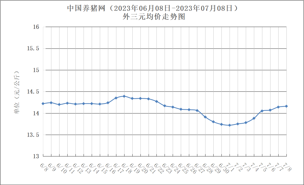 猪价系统数据监测如下:生猪(品种:外三元)均价为14.16元/公斤(7.08元/斤),价格较昨日上涨了0.02元/公斤(0.01元/斤);猪价环比下跌了0.42%;同比下跌了36.53%;