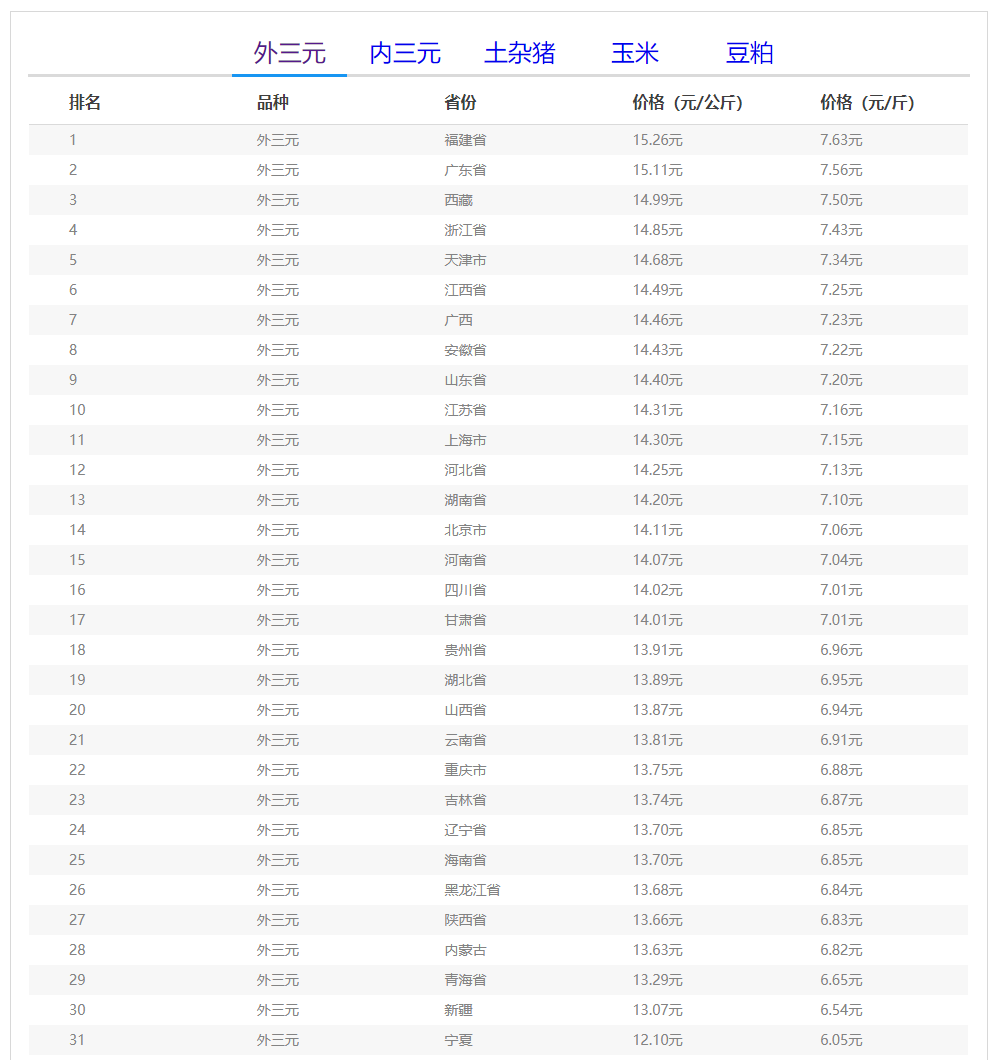 价格,外三元、内三元、土杂猪则为生猪品种。)