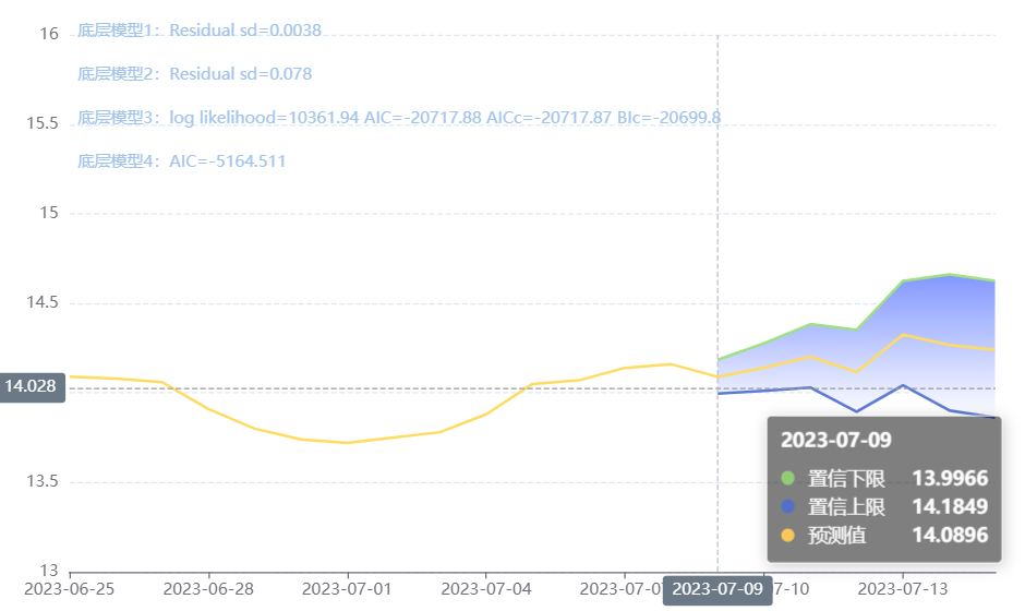 玄田算法是由项目课题组团队原创的非经典逻辑数值聚合理论和不确定性预测方法,构建了基于一致模算子的生猪价格预测模型。该模型采用的聚合函数及一致模相关理论与方法已获得多项国家自然科学基金和省级自然科学资金资助,并获得多项省级自然科学奖奖项。07月09日预测猪价为14.0896,置信区间在13.9966--14.1849之间。07月10日预测猪价为14.1410;07月11日预测猪价为14.2017。