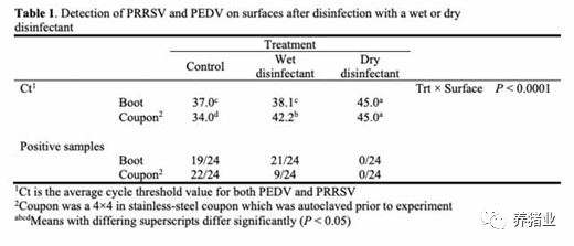 消毒行为也影响可检测的RNA数量,其中湿式消毒靴和对照靴中PEDV RNA的量大于PRRSV。