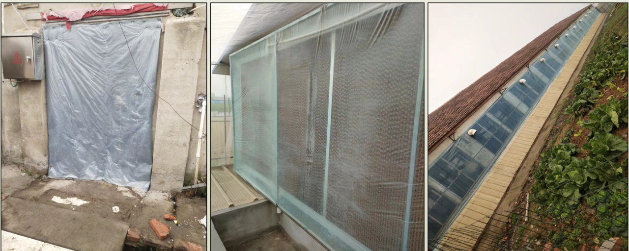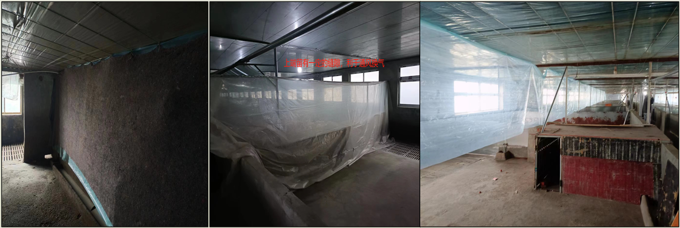 4、猪舍前端门口使用两道隔挡,最外侧的隔挡使用无纺布+薄膜,使用无纺布有利于压实薄膜,利于前端密封。第二道直接使用薄膜进行挡风处理。猪舍后端的薄膜隔挡要注意前端留有一定的缝隙,有利于猪舍的整体通风换气。