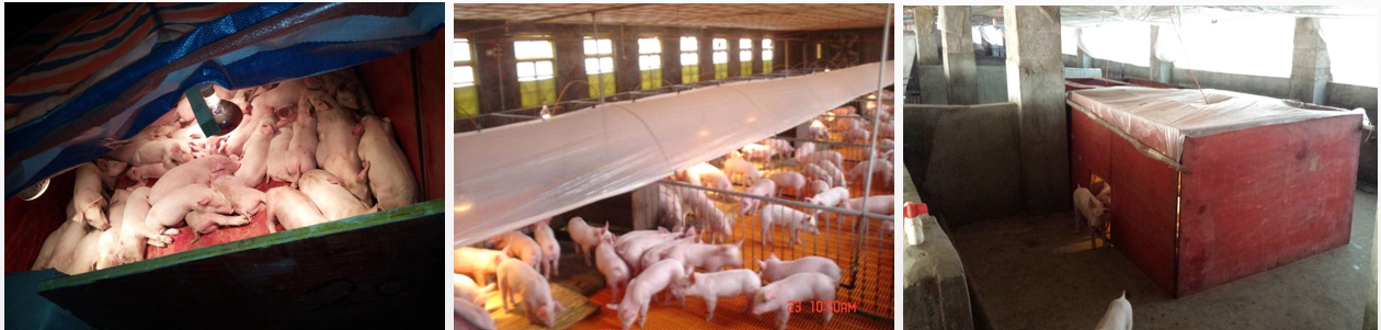 3、环境的保温箱搭建必须按照要求至少不低于0.1㎡/头猪。确保栏内每头猪只都可以睡在保温箱内。保温箱内必须吊挂保温灯,环境较差的猪栏要求放置2个。