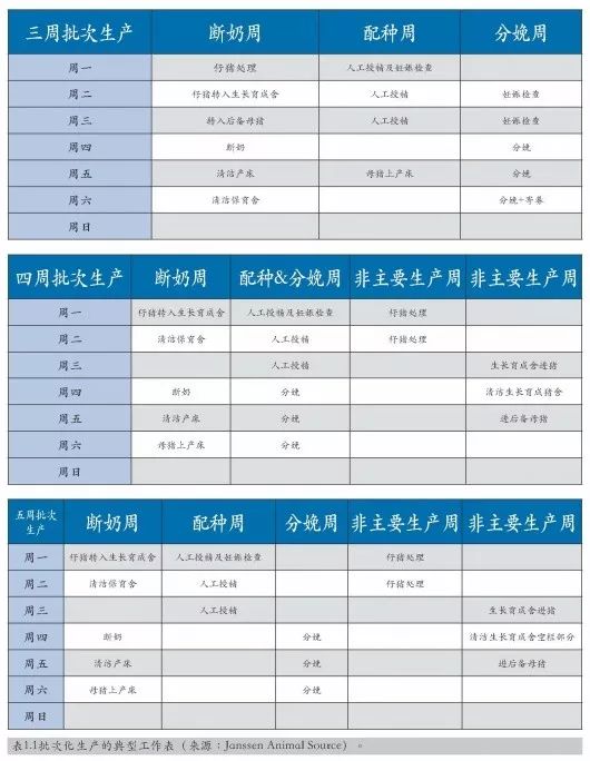 传统的连续性生产方式,每周都有母猪转到分娩舍,而其他母猪有的需要配种,有的需要断奶。也就是说, 每周都要进行这3个生产活动:分娩、断奶和配种。这就是所谓的周批次管理。