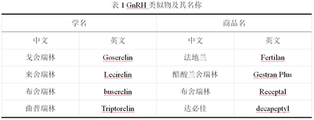 GnRH为十个氨基酸组成的短肽,主要促进垂体前叶促性腺激素合成和释放,并以促LH释放为主。脊椎动物中第1~4位氨基酸和第9、10位氨基酸高度保守,但第6和第7位、第9和第10位氨基酸之间的肽键极易被裂解酶分解,因此GnRH在体内极易失活。猪GnRH于1971年得到分离并鉴定,为提高GnRH的稳定性,布舍瑞林、曲普瑞林、戈舍瑞林、亮丙瑞林、那法瑞林等一系列GnRH类似物被合成。与GnRH相比,其类似物具有化学纯度高、发挥作用迅速、半衰期短等优点,研究表明母猪注射外源性GnRH或其类似物,可诱导内源性排卵前LH峰,并降低发情排卵间隔变异,用于排卵同步化处理。目前GnRH类似物已广泛应用于临床,但由于成本或专利授权问题,兽用依然受到很大限制,包括在生产中母猪控制排卵的应用。目前,用于试验性研究母猪控制排卵药物的部分类似物如表1所示:
