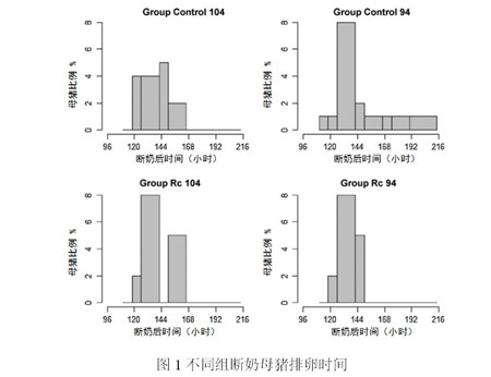 Botte为研究布舍瑞林对断奶母猪同步排卵的有效性,分别在大白母猪断奶后94h(Rc-94组)、104h(RC-104组)肌肉注射1mL含10μg布舍瑞林,并在两个相应时间点设立对照注射等量生理盐水(Con-94组、Con-104组)。结果显示,Rc-94组母猪在断奶后126~150h,即布舍瑞林处理后32~56h内排卵母猪比例达到100%,而RC-104组Con-94组、Con-104组分别仅有66.7%、68.7%、86.6%,说明布舍瑞林注射时间对母猪排卵同步化至关重要,不仅能够使母猪排卵更集中,而且能提前排卵(如图1所示)。进一步,母猪静立发情后6~12h第1次配种,间隔6~12h进行第2次配种,最终母猪繁殖性能未受影响。