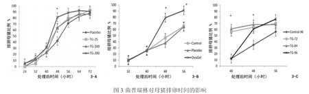 2000年,kraeling发现100μg曲普瑞林能够诱导经雌激素处理的后备母猪出现LH峰,随后,Baer研究显示曲普瑞林能够诱导母猪排卵。Knox将曲普瑞林制备成凝胶,通过阴道黏膜给药方式,并设定不同给药时间和剂量。研究发现,200μg TG组处理后48h有81%的母猪发生排卵,而对照组及25μg、100μg组分别只有42%、63%、64%的母猪发生排卵(图3-A)。进一步在断奶后72h、84h、96h不同时间进行等剂量200μg TG处理,结果显示,在72h、84h两个处理组母猪断奶排卵间隔显著缩短,而且在处理后40h,两组母猪排卵比例分别达到56.5%和62.2%,但是,96h与对照组排卵母猪比例仅为13%。处理后48h,72h、84h、96h 3个实验组排卵母猪比例均达到64%,而但对照组仅有34%,差异显著(图3-B)。研究发现,虽然72h、84h处理后母猪排卵提前至少10h,但经过TG处理后24~28h单次输精,与对照组及96h组相比,两组配种妊娠率低20%~50%,分娩率降低30%~50%。最终通过母猪断奶后96h阴道放置200μg曲普瑞林,结果显示48h内有约80%排卵,排卵母猪比例比空白对照及阴性对照多355~43%(图3-C),并且在母猪发情时进行第1次输精,间隔24h后再次输精,母猪繁殖性能表现正常。关于72h、84h进行曲普瑞林处理后,妊娠率、分娩率急剧下降,笔者分析可能是因为激素处理时间较早,此时卵子尚未彻底成熟,在曲普瑞林诱发的LH峰下卵泡强行提前排卵,导致配种后卵子未能受精,也可能是未成熟的卵子受精后胚胎质量较低随后死亡,导致两个组母猪妊娠率、分娩率急剧下降。