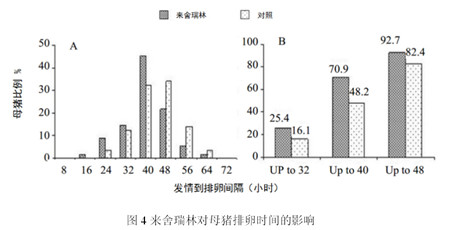 虽然早在2001年,已经有人工合成来舍瑞林,但在2010年,才将其用于母猪断奶后同步排卵研究。Fries依据胎次、体况、断奶至发情间隔及哺乳期时长,随机将康贝尔断奶母猪分为试验组和对照组,并在母猪首次静立发情时进行处理,试验组肌肉注射1mL含25μg Lecirelin,对照组注射等体积生理盐水。结果显示:来舍瑞林处理可以显著缩短发情持续时间(61.3h vs 66.3h),发情排卵间隔缩短4h,处理组母猪排卵更集中,发情后32h两组母猪排卵差异不显著(16.1% vs 25.4%),发情后40h处理组显著高于对照组(70.9% vs 48.2%),而在发情后48h两组母猪差异不显著(92.7% vs 82.4%)(图4)。母猪静立发情后12h第1次配种,间隔12h加配1次,结果显示:配种分娩率、产仔数等指标的差异均不显著。