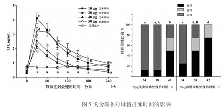 戈舍瑞林属于非专利产品,用于家畜诱导排卵,可有效降低成本。2007年,Brussow首次开展戈舍瑞林诱导母猪LH分泌相关研究。对长白巴罗斯研注射不同剂量戈舍瑞林,均能诱导机体LH浓度升高,其中注射20μg戈舍瑞林30min后,LH血浆浓度达到峰值(图5-A)。进一步通过腹腔内窥镜观测发现,虽然母猪注射戈舍瑞林和曲普瑞林后34~42h出现排卵,但是戈舍瑞林组排卵母猪比例在38h低于曲普瑞林组,注射后42h则差异不显著(图5-B)。同样作为GnRH类似物,虽然两者在结构上有所差异,以至于在体内生物活性可能表现不同,但笔者认为在该研究中,诱导母猪同步排卵上的差异性更可能是两组样本量太少(分别为8头、4头),两种激素之间对比可能不具有代表性。但通过与空白对照组相比,则能充分反映出外源性GnRH类似物能够有效诱导排卵前LH峰,并使母猪排卵更集中。
