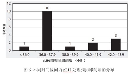 pLH:pLH是猪促黄体生成素,与hCG类似可直接作用于卵巢。研究发现大长母猪断奶时注射600IU PMSG,间隔80h后注射5mg pLH,通过B超观测排卵时间。能够使母猪在34.25~42.5h之间发生排卵,平均排卵时间为38.2h(图6)。进一步研究显示参繁母猪妊娠率、配种母猪妊娠率、分娩率均高于非pLH处理母猪。结合PMSG促卵泡同步发育后,再用pLH同步排卵处理,各项指标均有进一步提升。