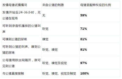 1 、赶公猪在栏前缓慢走动,母猪和公猪鼻对鼻直接接触,让母猪能够嗅到、听到、看到、接触到公猪,让母猪的嗅觉、视觉、听觉、触觉都能感受的公猪的信息。