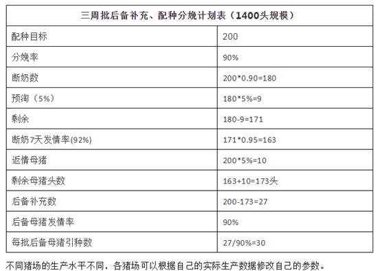 在批次生产中,为了保证均衡生产,需要制定详细的配种计划与后备母猪的补充计划,在本批次配种结束后就可以根据胎次、以往的返情和空坏等情况计算出本批次需要补充的后备母猪数量,按照需求进行补充后备母猪。