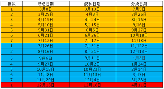 将上面的断奶日期、配种日期和分娩日期全部都列出来以后,观察他们之间是否有冲突,没有冲突并且符合本场的生产水平就说明该方案可行。