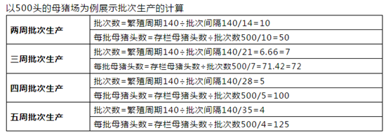 以仔猪21天断奶为例,母猪的繁殖周期为140天,那么批次生产的计算就基于我们采取几周的批次生产方案,如两周批次生产,每批次之间的间隔为14天,因为14为140的1/10,所以每批次的配种头数也应该为总母猪头数的1/10,因此可以得出批次生产的计算公式如下:
