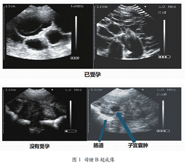 对于没有返情的母猪,在妊娠第23~25天时通过猪专用B超仪进行孕检,对可疑的猪只间隔5d左右进行复检。具体操作方法为:确保猪只处于安静状态,站立或者侧卧。孕检位点为母猪大腿内侧,倒数第1和2个乳头中间向上约5cm处(确保无毛),打开电源,确保B超仪运转正常,在探头处涂抹专用耦合剂。操作人员一只手持B超仪,另一只手持探头在检测位点斜向上45°贴紧母猪腹壁,且缓慢调整方向,观察显示器。若显示器观察到2个以上孕泡表明母猪孕检阳性;若找不到换另外一侧继续寻找,若均找不到孕泡则表明母猪孕检阴性;建议5d后复检。若再次孕检阴性则表明本头猪空怀(如图1)。