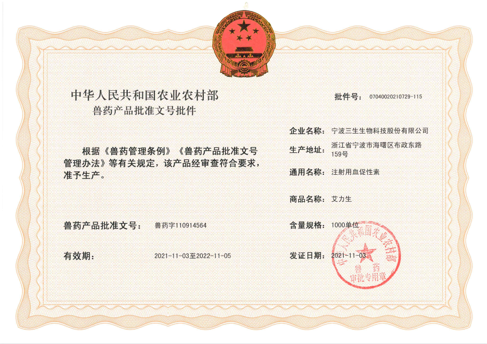 孕马血清(PMSG)是由孕马子宫内膜杯状细胞分泌到血液中的糖蛋白激素,具有FSH和LH的双重作用,主要作用是刺激卵泡发育和成熟。宁波三生的明星产品--艾力生,大受市场青睐,主要成分是孕马血清,它对母畜具有刺激卵泡发育和成熟,分泌雌激素的作用;对于公畜具有促进睾丸间质细胞发育,促进精子生产、分泌雄激素的作用。艾力生主要用于母畜催情和促进卵泡发育,也可用于胚胎移植时的超数排卵。