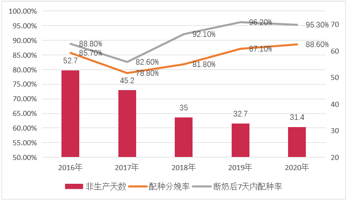 断奶7天内配种率提升,繁殖成绩改善,非生产天数显著下降。