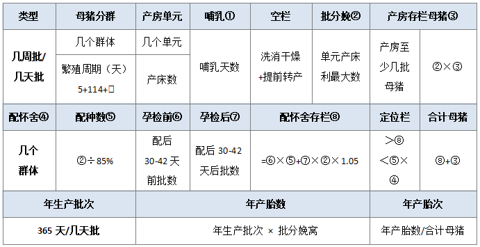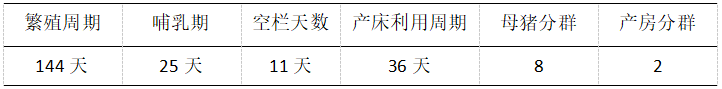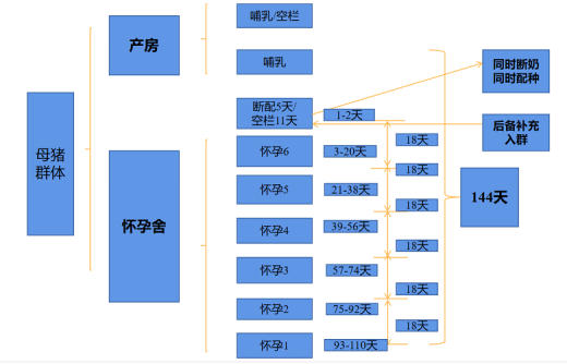 (1)18天批生产中,母猪共分8个群体,分别处在产房和配怀舍里。18天批生产需要二个单元的产房,其中至少有一个单元的母猪群体一直处于哺乳阶段,另一单元哺乳一定时间后需要断奶,产房需清空和清洗消毒,并空栏一定时间。配怀舍有7个群体,必须保证至少有7个群体的栏位,分别是断奶配种群、怀孕18天周群、怀孕36天周群、怀孕54天周群、怀孕72天周群、怀孕90天周群、怀孕108天周群,每个群体间隔时间18天。