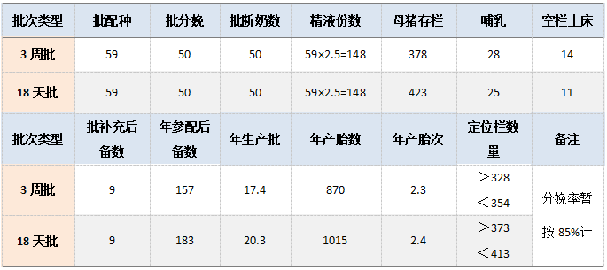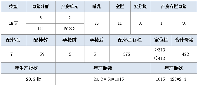 如表2所示,做18天批,母猪分为8个群体,繁殖周期144天,产房分为2个单元,各50个产床(100÷2),即批分娩目标为50头,哺乳25天,清洗消毒空栏时间11天,另外产房中至少有一批母猪,产房存栏母猪50头;配怀舍分为7批,配种目标是50÷85%=59头;由于2批在孕检前,5批在孕检后,根据公式计算配怀舍存栏373头,定位栏的数目在373~413头之间,合计母猪为423头;一年可以生产365÷18=20.3批,年产胎数是20.3×50=1015胎,年产胎次为1015÷423=2.4次。