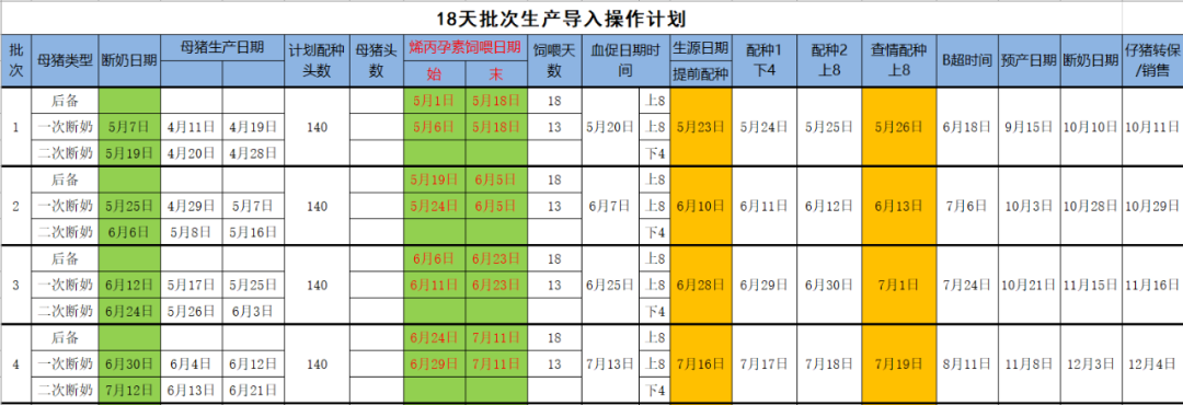 在传统连续生产怎样转到18天批次生产?它与三周批一样,也需要批次导入,也就是18天连续生产的猪怎样进行一次性发情配种,需分二次断奶,第一次断奶后用孕力宝(烯丙孕素)抑制发情,等待第二次断奶母猪断奶后一起用定时输精统一配种。其中断奶猪喂孕力宝(烯丙孕素)需要在断奶前一天饲喂,停药与后备同步,导入前需设计18天批导入表,也就是批次可视操作。