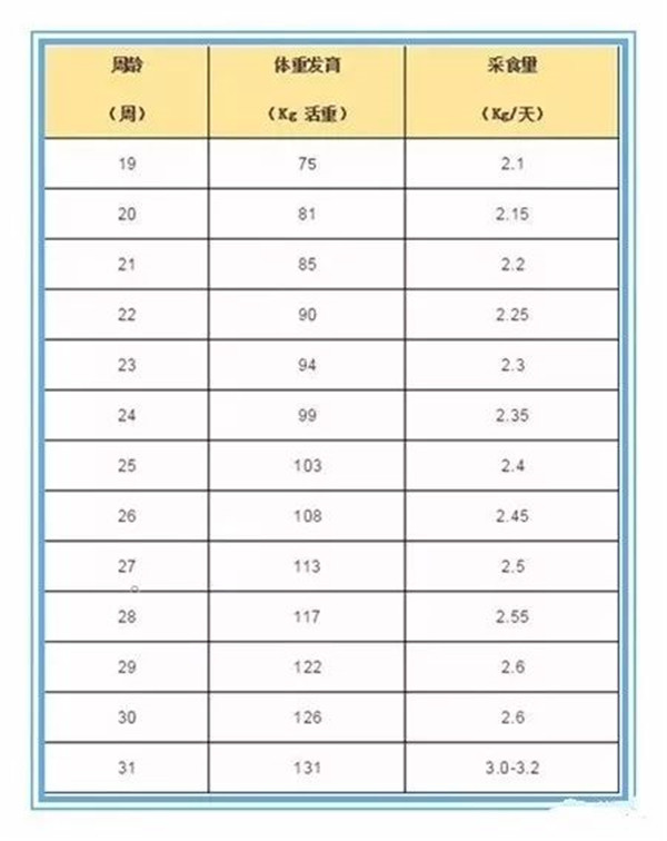 A.每2周随机称取至少6头后备母猪体重,对照上表给出的日龄与体重的关系,及时调整后备母猪的采食量;严格控制日龄、体重、日饲喂量三者关系。