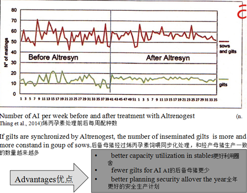 工作人员压力明显缓解,是后备母猪更好的发情鉴定方法,并且可以最优化利用分娩舍和等待区域,甚至厂房设施也能得到有效利用;其次,对母猪遗传性能潜力的最佳利用,尤其是分娩率和产仔数。最后,有效保障了动物健康水平,当然同一批次动物生产管理需要同事间协作配合。另外,烯丙孕素处理抑制后备母猪发情,通过畜牧学方法有助于促使后备母猪初情期和发情同期化。