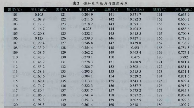 饱和蒸汽压力与温度关系对照表见表2(程贺,1995)。根据压力表、温度计和水分仪的显示,与表2中饱和蒸汽的压力温度关系对照表,就可明了蒸汽的饱和程度。如果在同样气压下,显示温度比理论温度低,即说明此蒸汽为非饱和蒸汽;如果高于理论温度,则说明此蒸汽为过饱和蒸汽。此时可以利用减压阀和疏水阀来控制蒸汽的饱和程度。