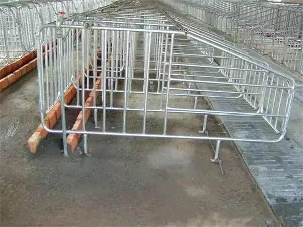 母猪限位栏采用母猪限位栏能有效地节省占地空间,最大限度地把有限建筑面积发挥到极限,同时更易于对妊娠母猪的管理。热镀锌钢管焊接,坚固耐用,耐腐蚀,好清洗。在养猪厂中也叫做单体限位栏,是妊娠舍中的母猪所在的位置。母猪限位栏规格:1000mm(高度)×2200mm×600mm(参考丹麦)。
