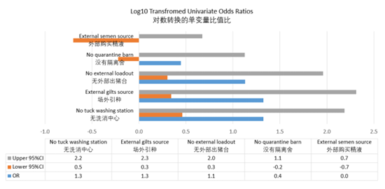 隔离舍和人员隔离也是感染非瘟的风险因素,但由于置信区间包含1, 这两种因素不是主要风险因素。