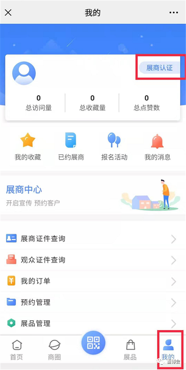 第二步:选择“我的”确认是否已经登录企业账号(登录本届购买展位的账号),如果未登录点击“展商认证”选择“已有账号登陆”。