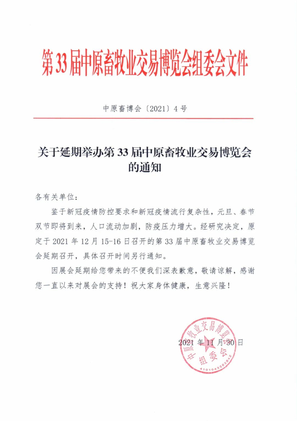 关于延期举办第33届中原畜牧业交易博览会的通知