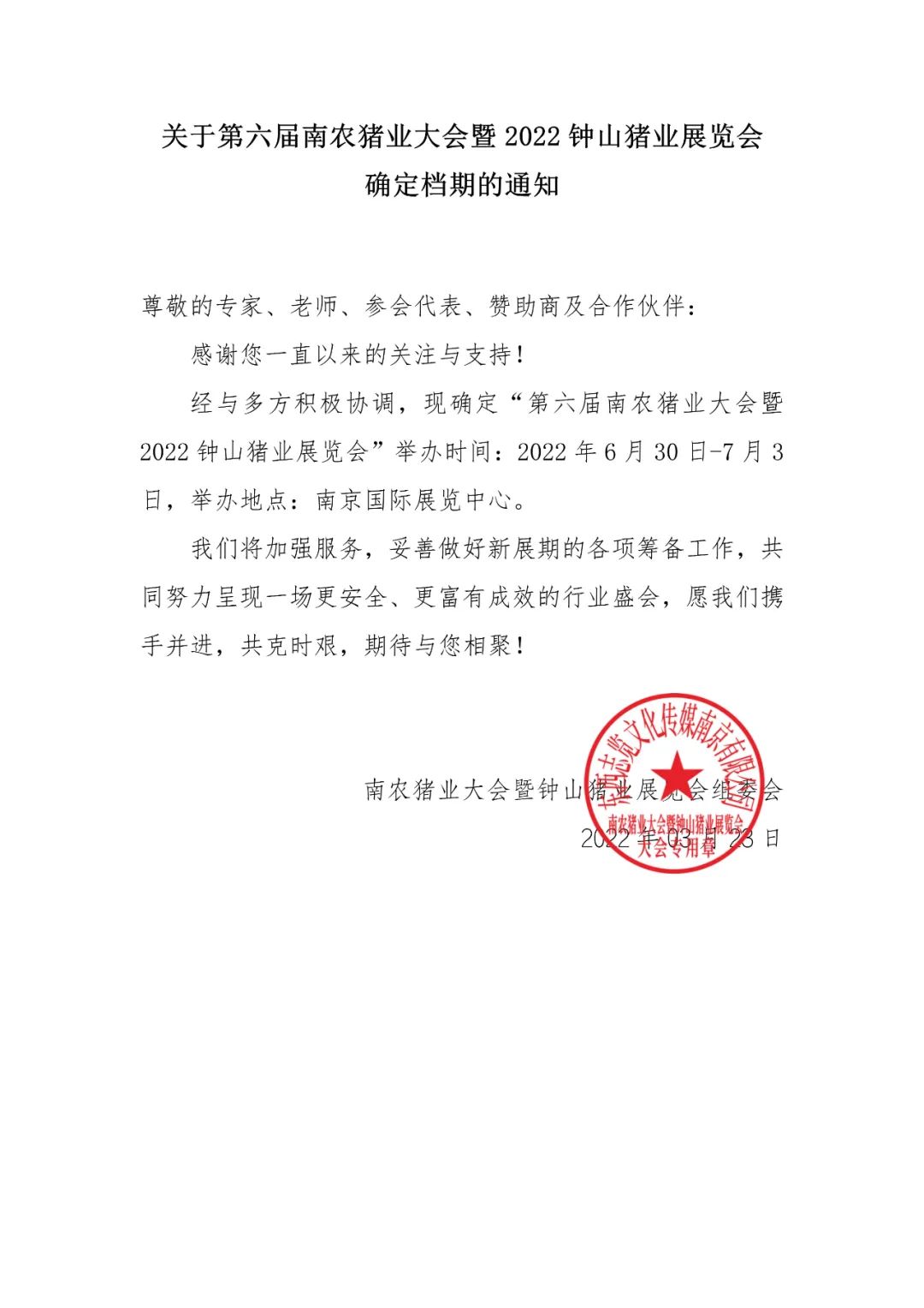 感谢您一直以来的关注与支持!经与多方积极协调,现确定“第六届南农猪业大会暨2022钟山猪业展览会”举办时间:2022年6月30日-7月3日,举办地点:南京国际展览中心。