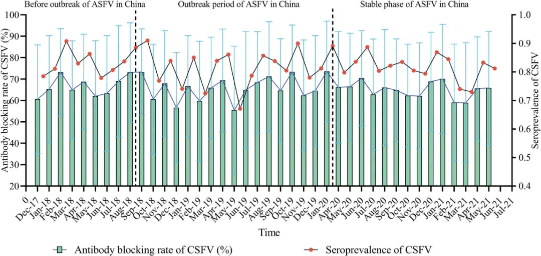 图:非瘟爆发前、中、后期经典猪瘟抗体阻断率和血清阳性率变化