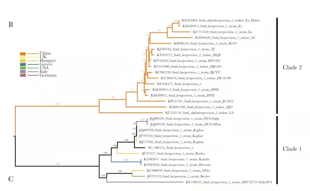 PRV可以分为两个基因亚型(见下图),GⅠ在欧洲、美国、中国广泛流行,GⅡ在亚洲分离到,是我国流行的优势毒株(He et al.2019)。