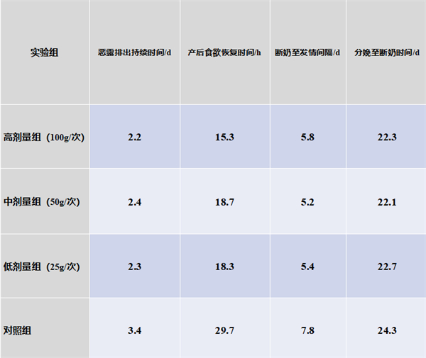 四)改善子宫环境、促进子宫复旧,断奶后一周内发情率提升83.5%以上,受孕率提升92.8%以上。