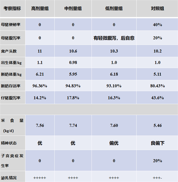 二)母猪产后食欲恢复时间缩短半天。采食量提升20%,泌乳量明显增加和奶质明显提升,仔猪腹泻率降低29.4%。