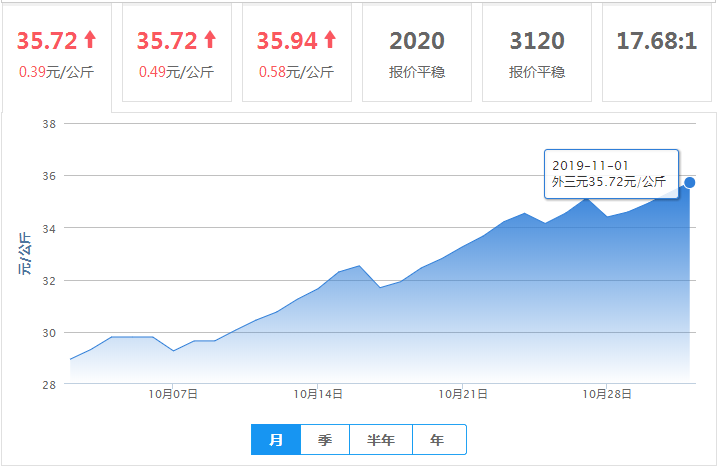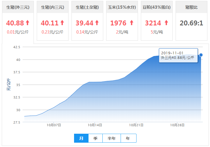 2019年11月1日,据中国电子游艺网站下载安装 猪价系统数据监测显示,我国外三元生猪价格为40.88元/公斤,价格较昨日上涨0.01元/公斤;去年同期外三元生猪价格为13.71元/公斤,今日较去年同期上涨27.17元/公斤,涨幅为198%;