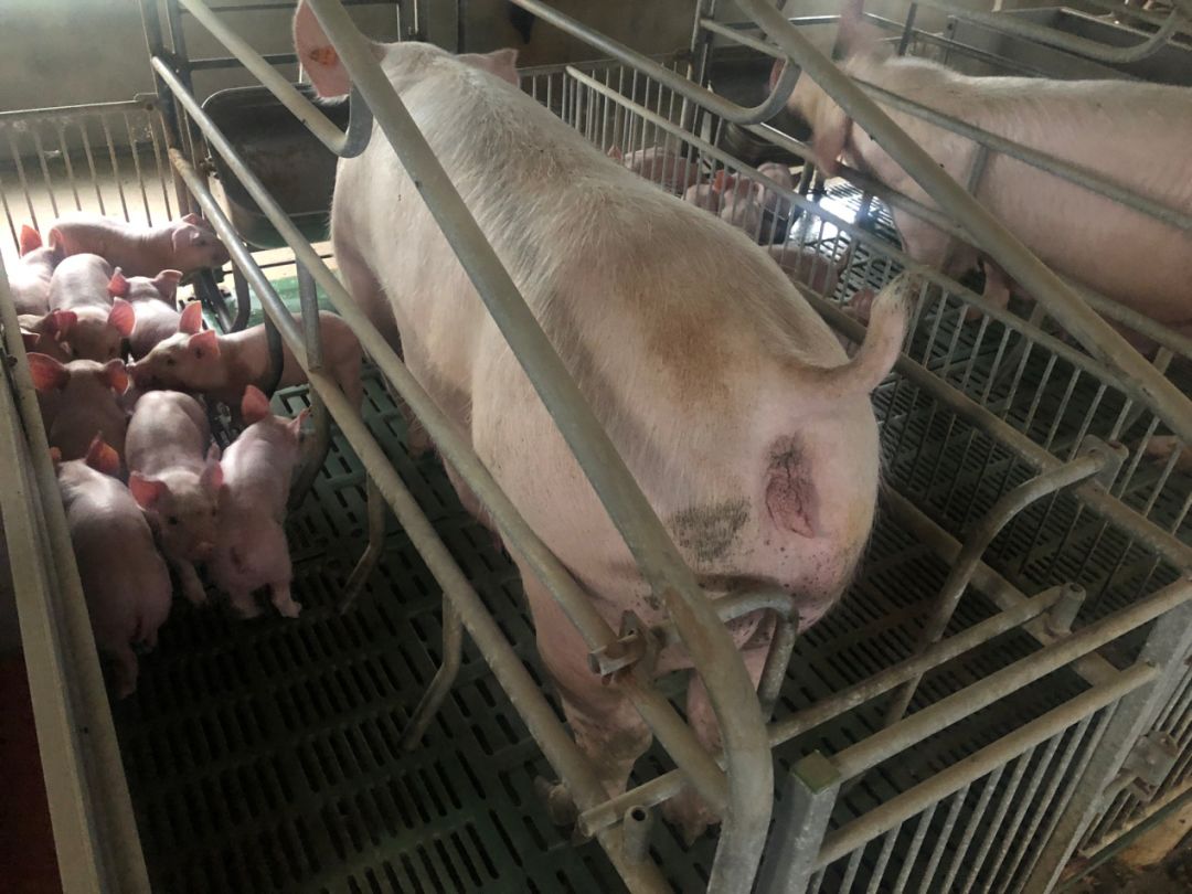 产床上的母猪体况管理到位,膘情适中,乳腺发育好,奶水充足,仔猪圆滚红润整齐度高,没有见到有拉稀腹泻之仔猪,平均21日龄断奶,断奶窝重70公斤上下。19窝泌乳仔猪共计211头,没有发现1头是僵猪或者病弱的。